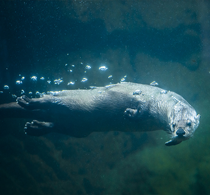 Four foot of buoyant double-furred body and a blunt sensitive snout with teeth built for crushing not tearing. Their keen-eyed intelligent face is edged with whiskers that no doubt help in the murky kelp of their native shoreline. When underwater, with their nostrils and ears closed, they rely on agility over speed, their pulsing body power combining with their webbed hind feet and rudder-like tails. Above the water they hear as well as their badger brothers, but under the waves it seems they are particularly sensitive to high-frequency sounds.